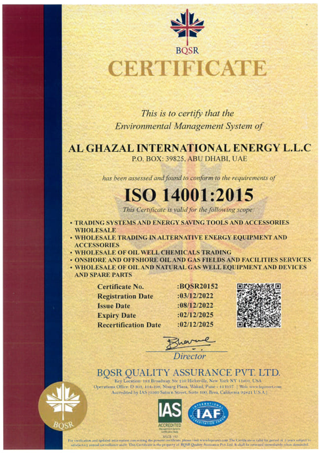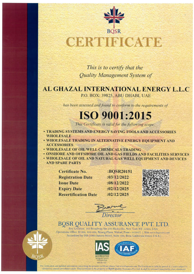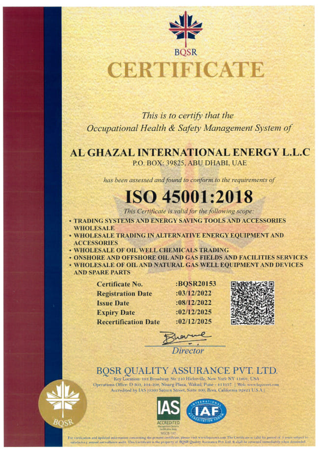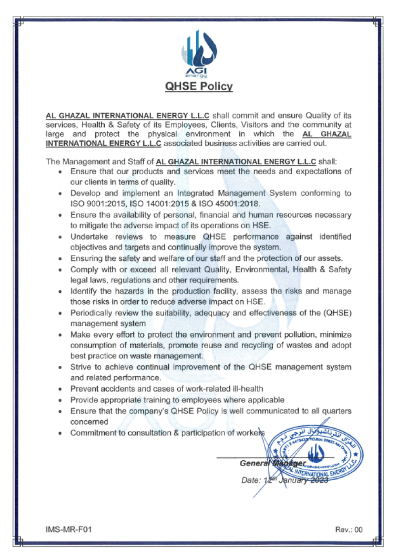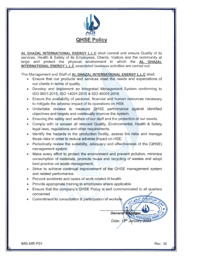 AL GHAZAL INTERNATIONAL ENERGY L.L.C. shall to commit and ensure quality of its services, the Health & Safety of its Employees, Clients, visitors and the community at large and protect the physical environment in which the AL GHAZAL INTERNATIONAL ENERGY L.L.C associated business activities are carried out.